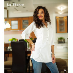 La Pierre törtfehér, karcsúsított zsorzsett anyagú ing, V-nyakkivágással, 3/4 ujjhosszal. Anyag: 67% pamut, 33% polyamid