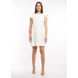 Törtfehér színű, fodros ujjú csipkés ruha, fodros szoknyarésszel. Hátrésze zárt. Rugalmas. Anyagösszetétel: 35% polyester, 65% viscose, 5% elasthan