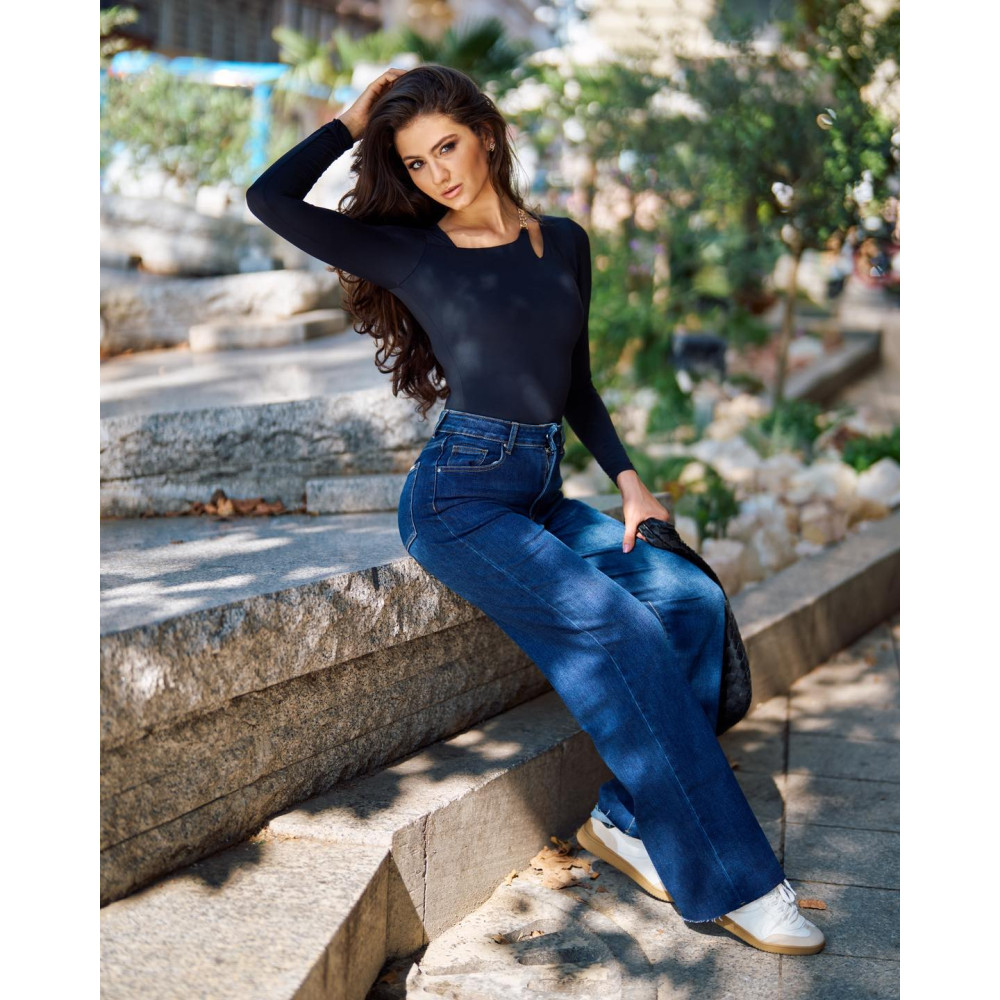 Kék színű, magas derekú szaggatott sztreccs farmer, teljesen szűk...