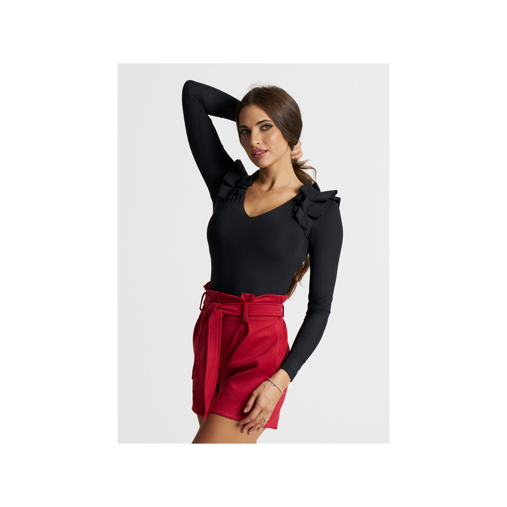 Envy fekete színű vállán rakott, V nyakú hosszú ujjú body. Rugalmas.