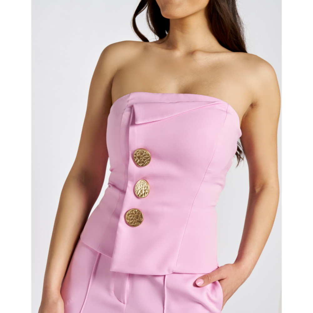 Envy rózsaszín, pánt nélküli felső, elején díszgombokkal. Hátrésze zárt, gumírozott,oldalán cipzárral.