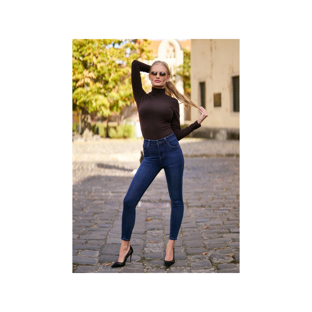 Kék színű, magas derekú szaggatott sztreccs farmer, teljesen szűk...