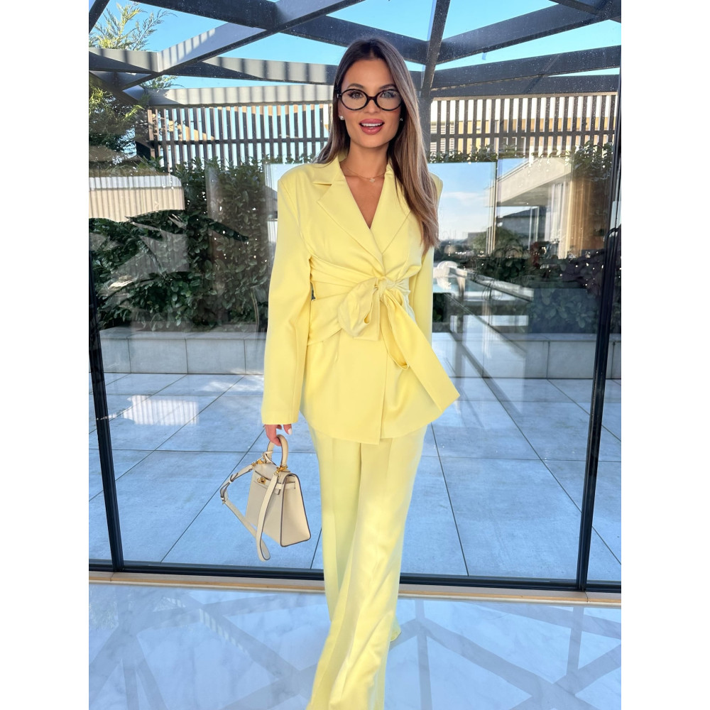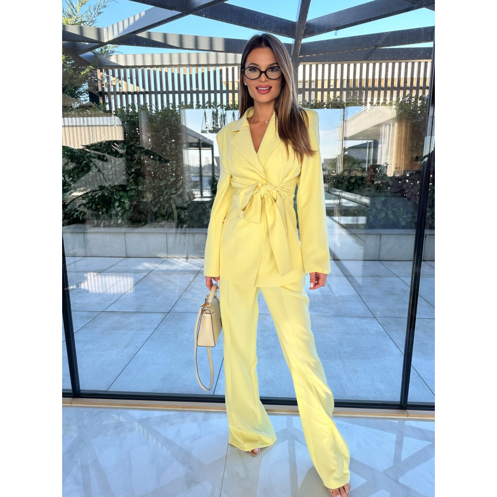 Kétrészes vaníliasárga garnitúra. A nadrág derék része gumírozott, a blézer kötővel és kötő nélkül is hordható. Enyhén rugalmas.