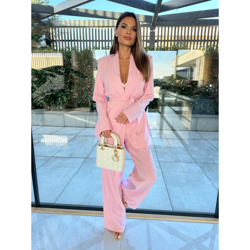 Kétrészes rózsaszín garnitúra. A nadrág derék része gumírozott, a blézer kötővel és kötő nélkül is hordható. Enyhén rugalmas.