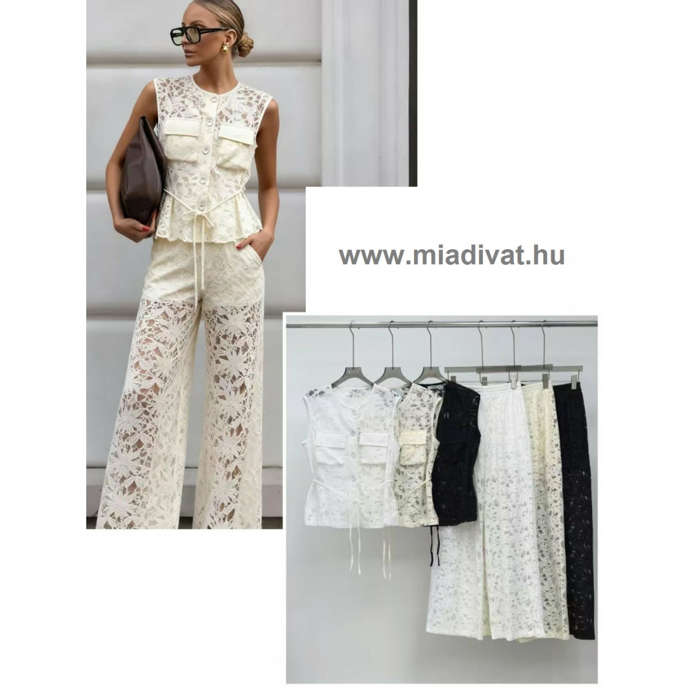 Törtfehér kétrészes csipke szett (nadrág+felső). A felső végig gombos,...