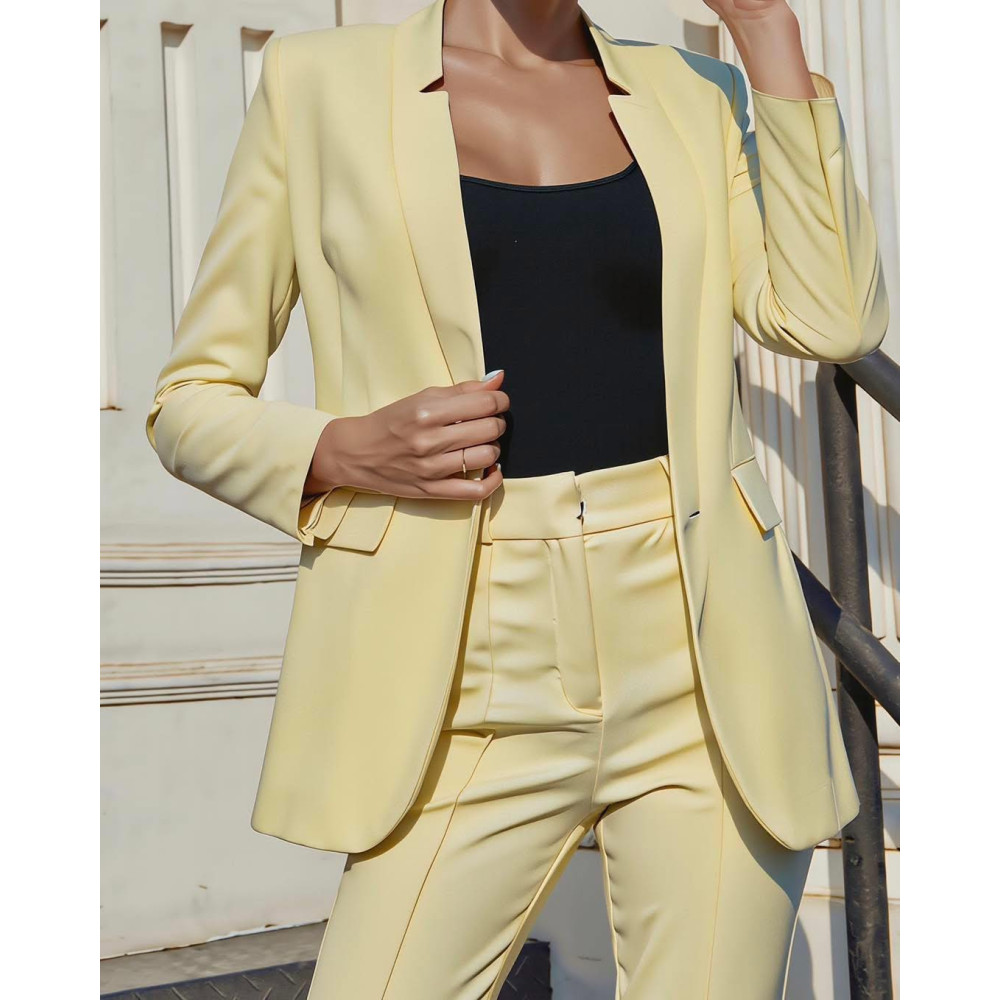 Sárga színű, letisztult fazonú, elegáns, zsebfedős, klasszikus bélelt blézer.