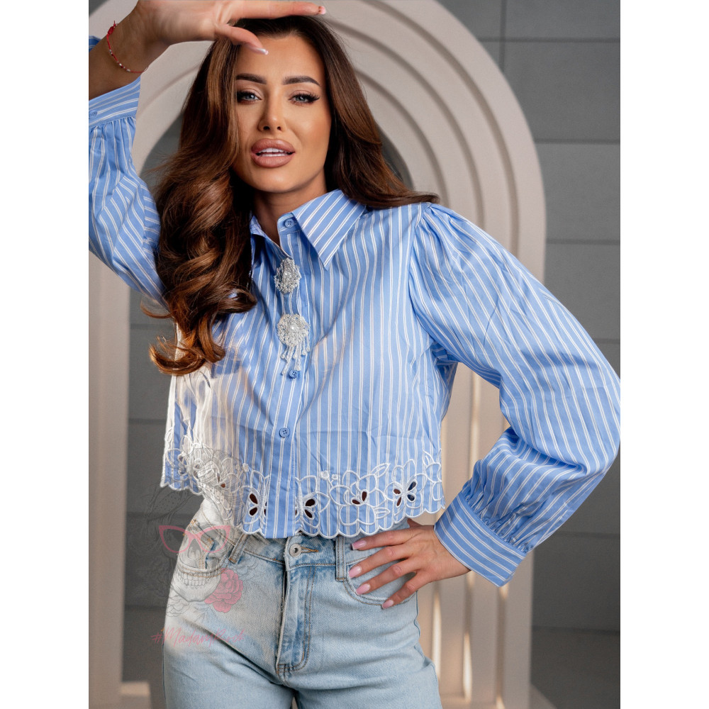 Kék-fehér csíkos ing, elején gyöngyös dísszel, derékrészen madeirával....