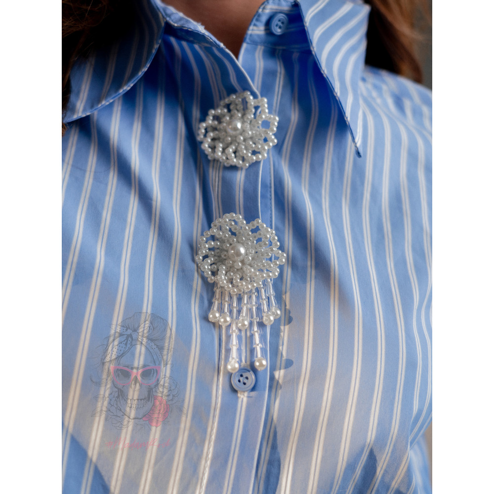 Kék-fehér csíkos ing, elején gyöngyös dísszel, derékrészen madeirával. Rugalmas.