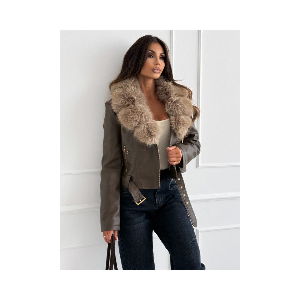 Barna színű, motoros dzseki szabású szőrmével díszitett, derekán csatos kabát. A szőrmegallér a kabátról teljesen legombolható, belül szőrme bélelt.