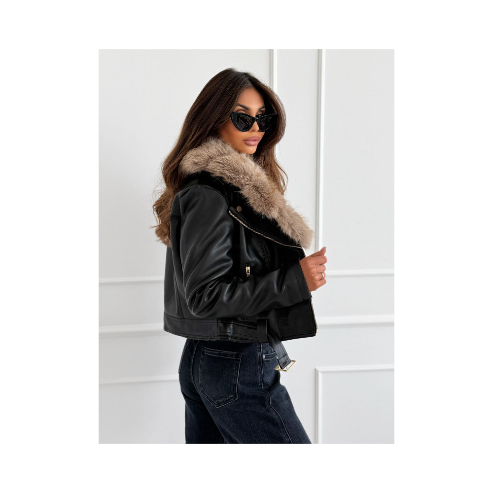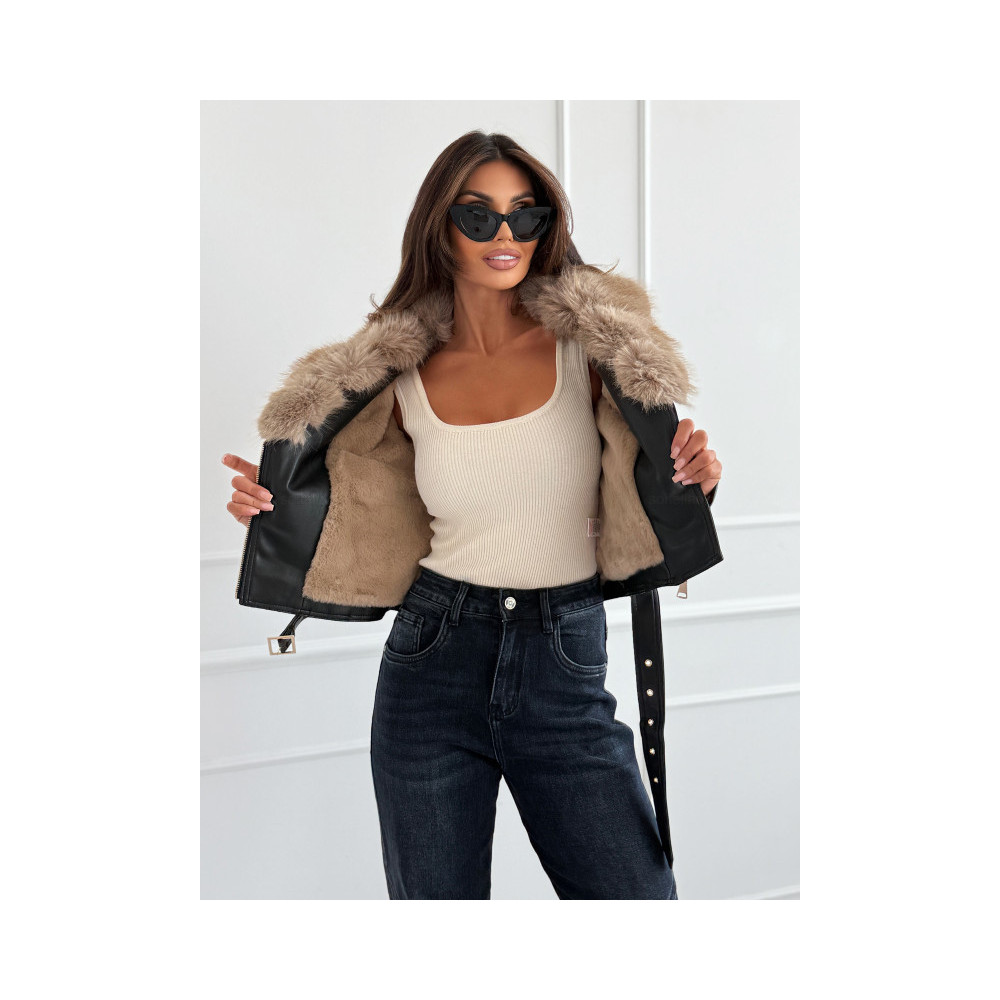 Barna színű, motoros dzseki szabású szőrmével díszitett, derekán csatos...