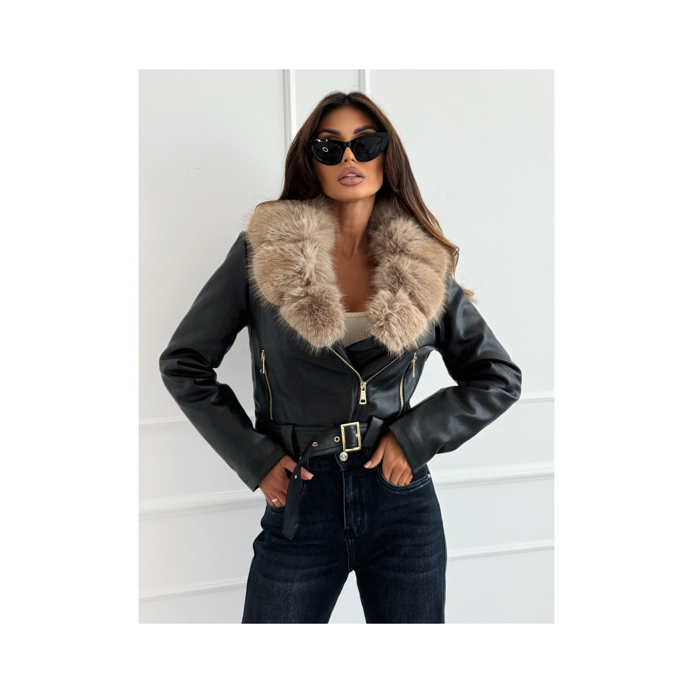 Barna színű, motoros dzseki szabású szőrmével díszitett, derekán csatos kabát. A szőrmegallér a kabátról teljesen legombolható, belül szőrme bélelt.