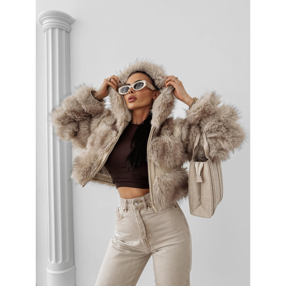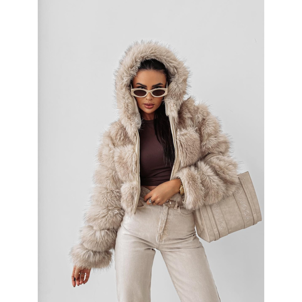 OLAVOGA beige színű kapucnis szőrme kabát. A kabát ujja lecipzározható...