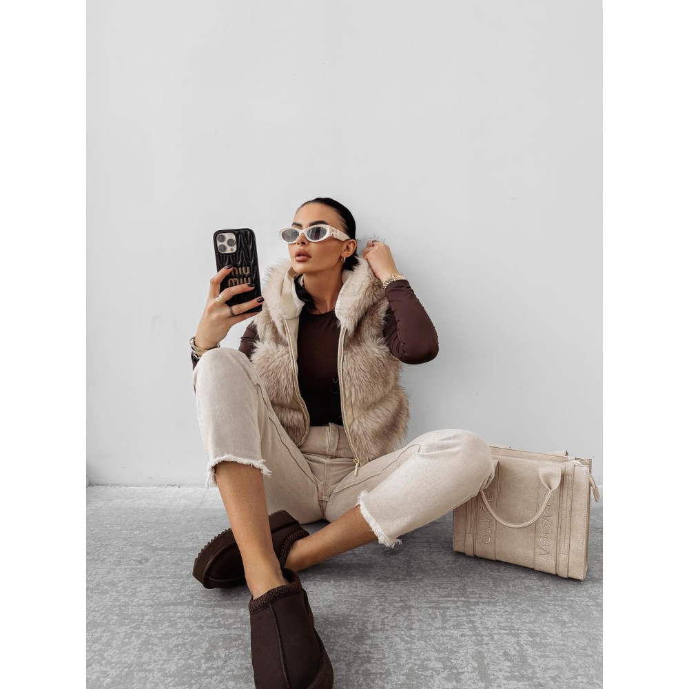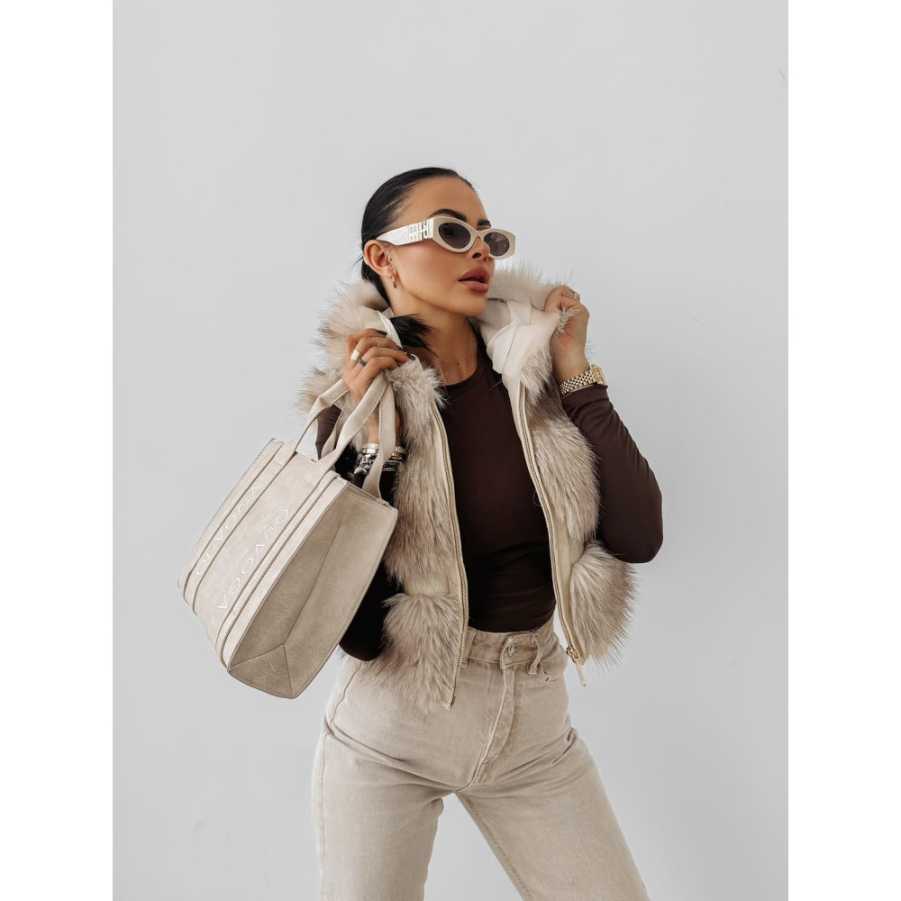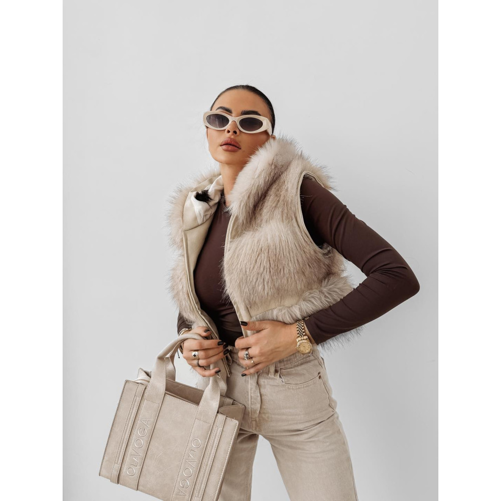 OLAVOGA beige színű kapucnis szőrme kabát. A kabát ujja lecipzározható és mellényként is viselhető.