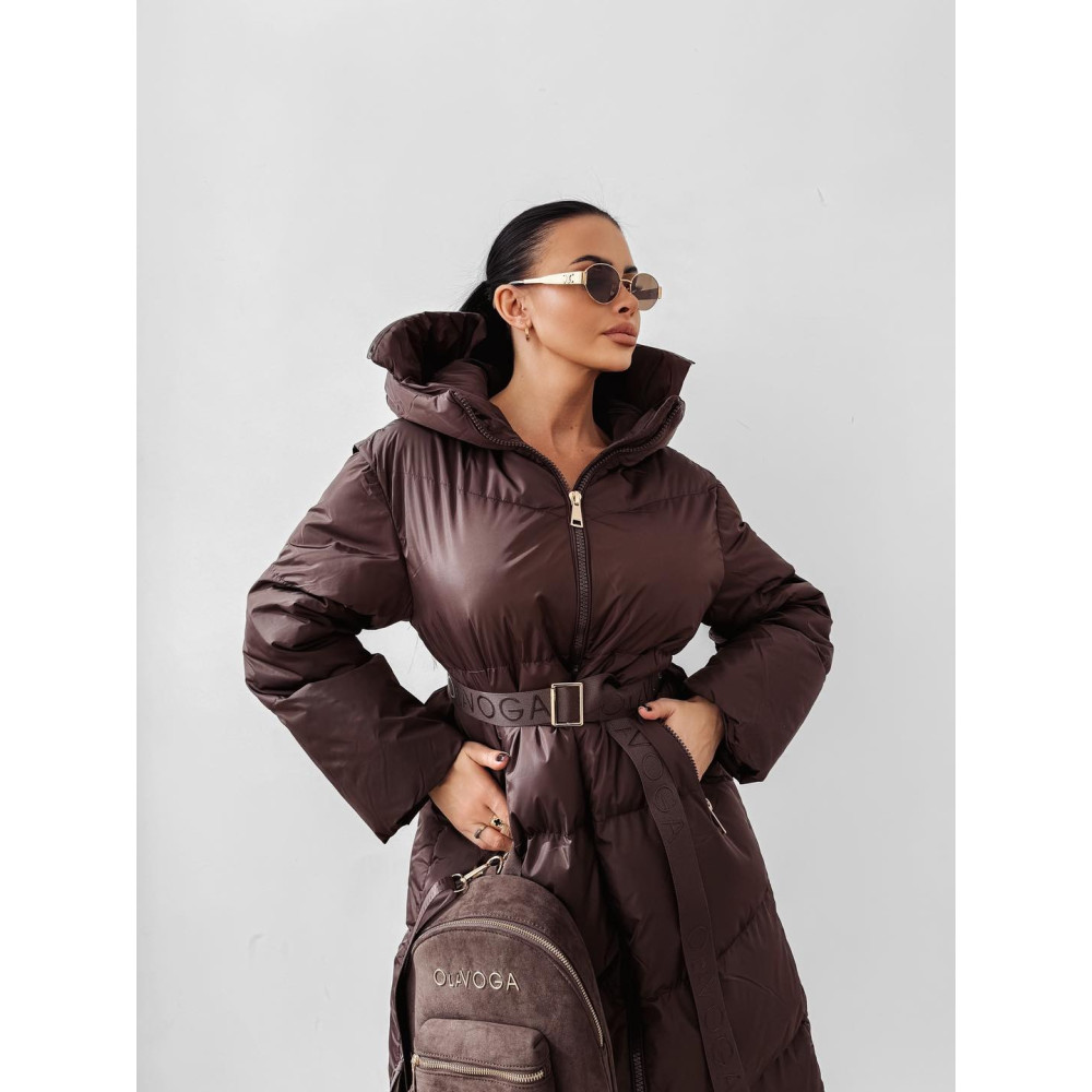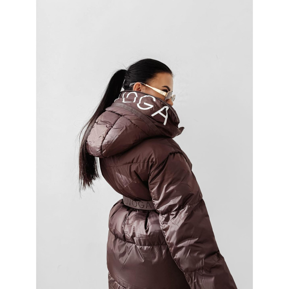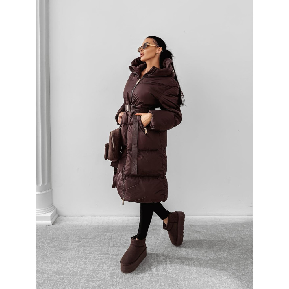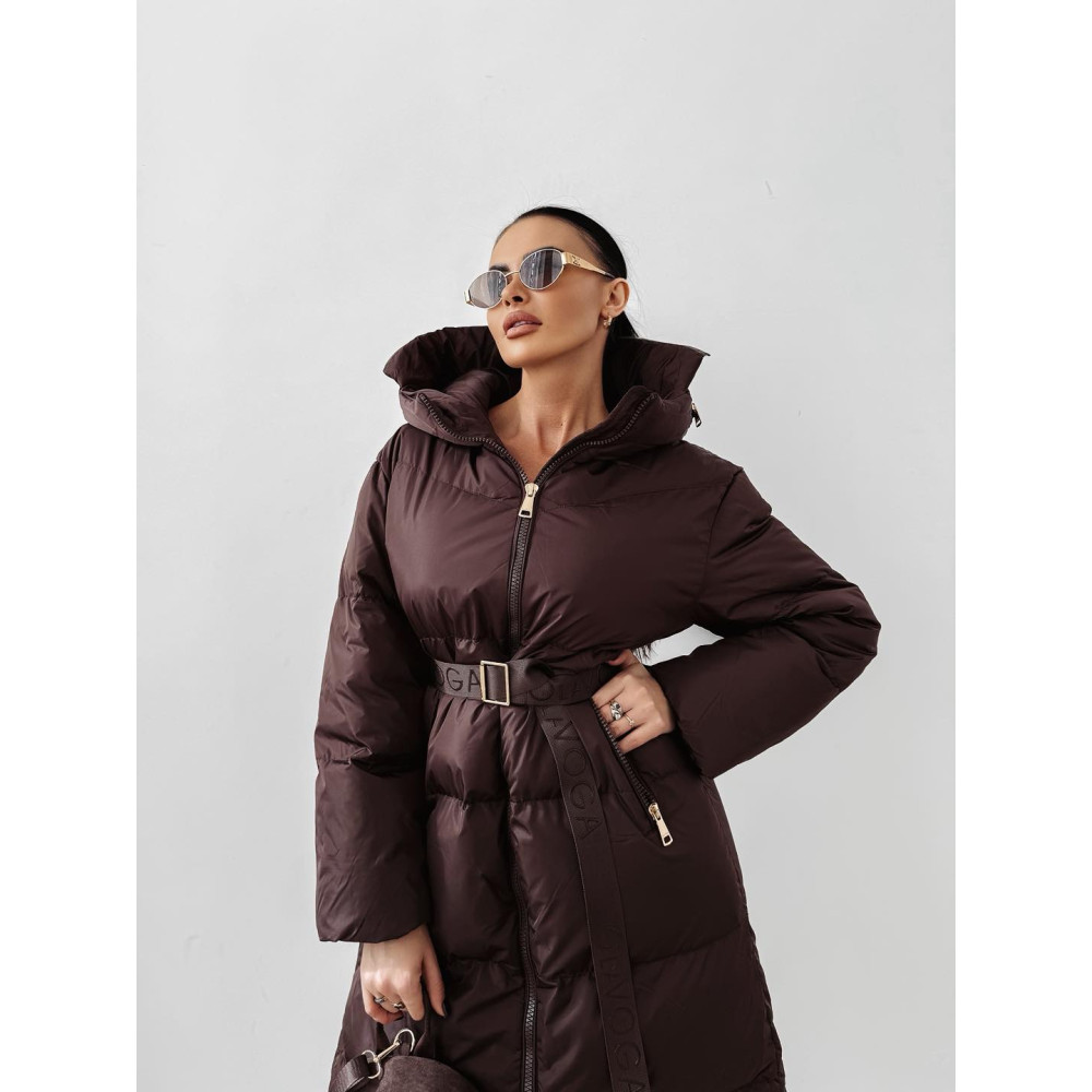 OLAVOGA csokibarna színű kapucnis téli kabát, OLAVOGA logo-s övvel.
