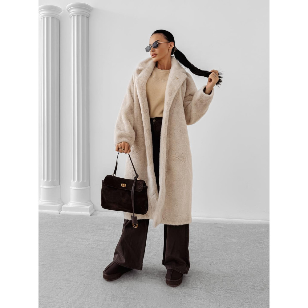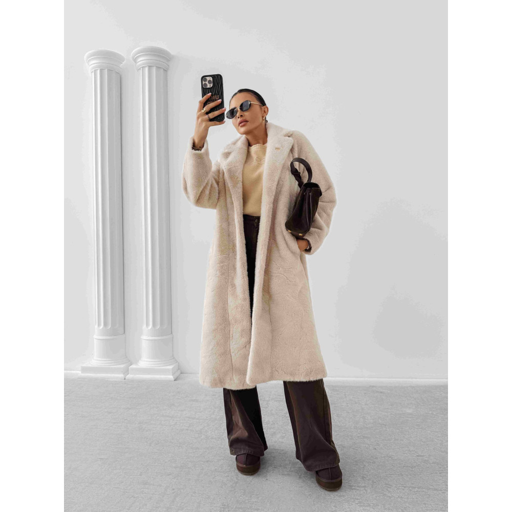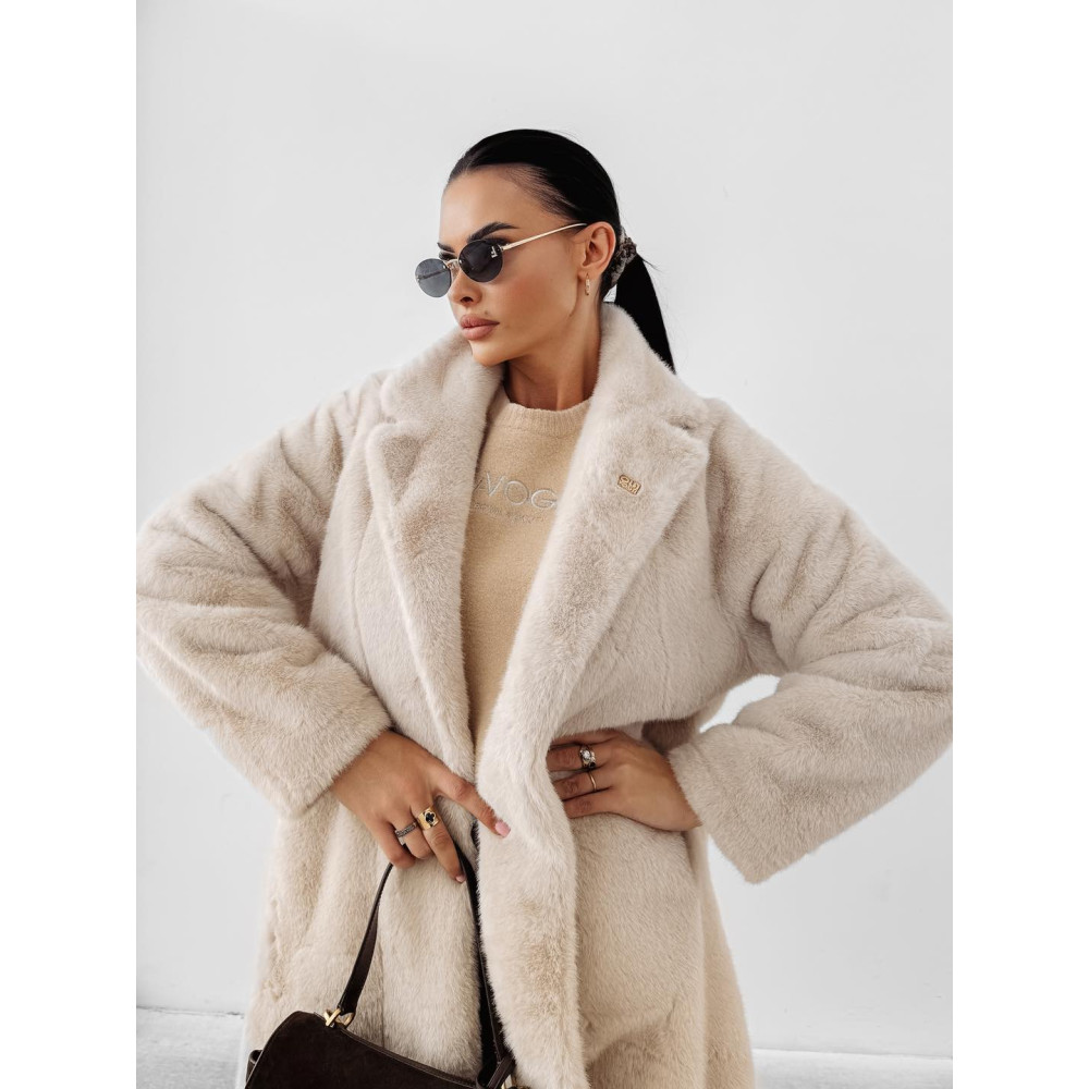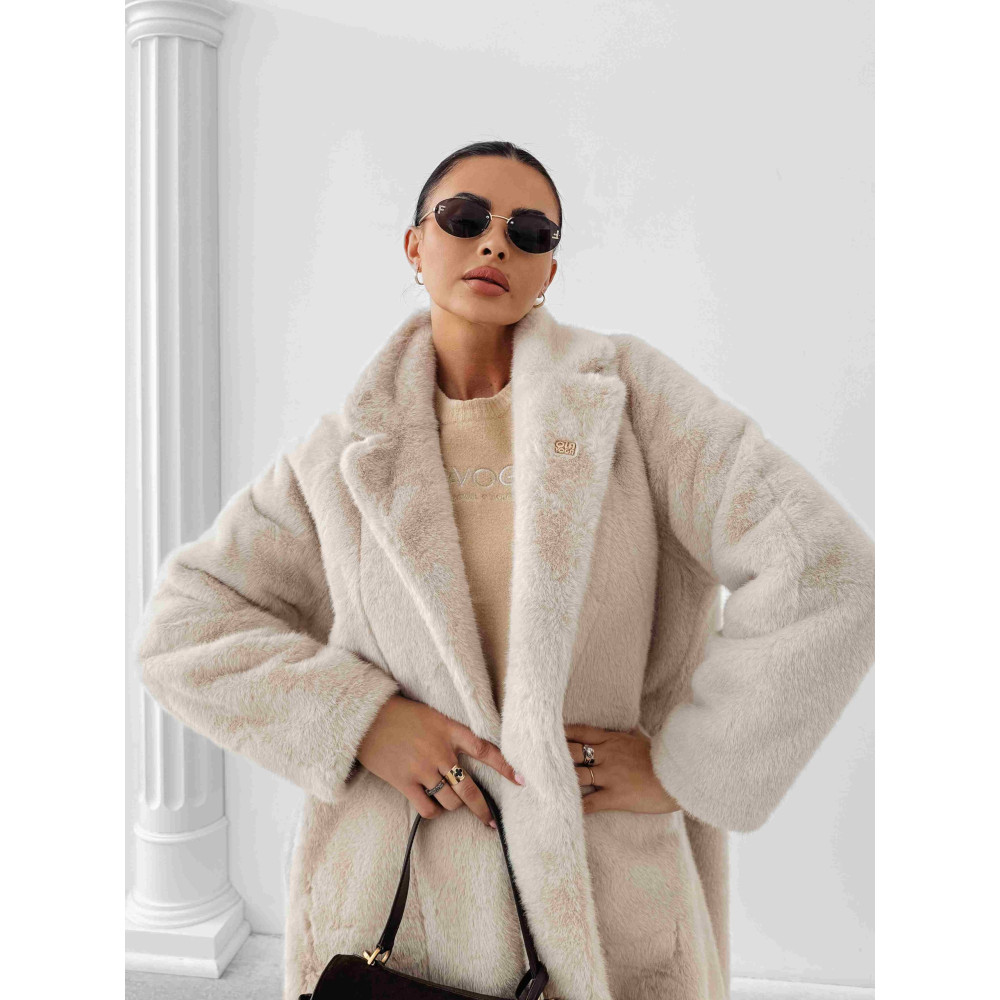 OLAVOGA bézs színű hosszú, puha szőrme kabát, derekán kötővel, arany színű OLAVOGA brossal.