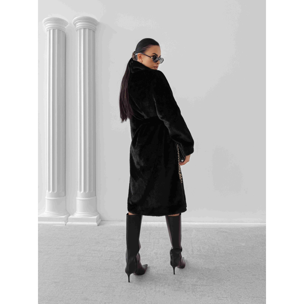 OLAVOGA fekete színű hosszú, puha szőrme kabát, derekán kötővel, arany színű OLAVOGA brossal.