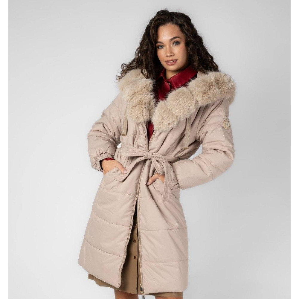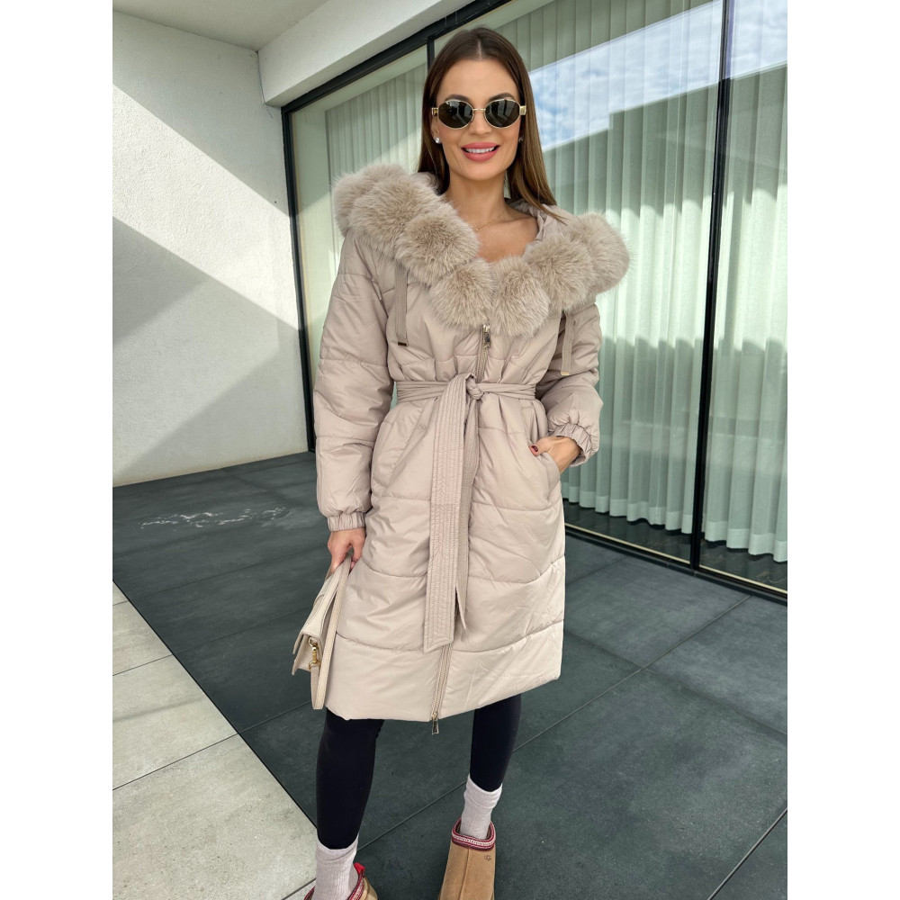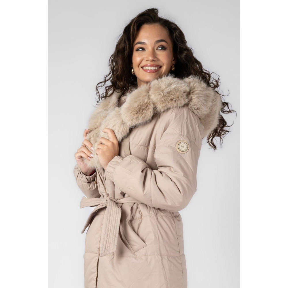 Beige színű nagy prémes, kapucnis téli kabát övvel. A prém legombolható.