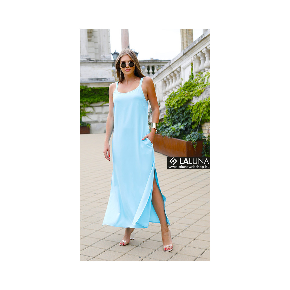 LaLuna Kolett világos kék maxi ruha, pántos, zsebes, oldalt sliccelt.