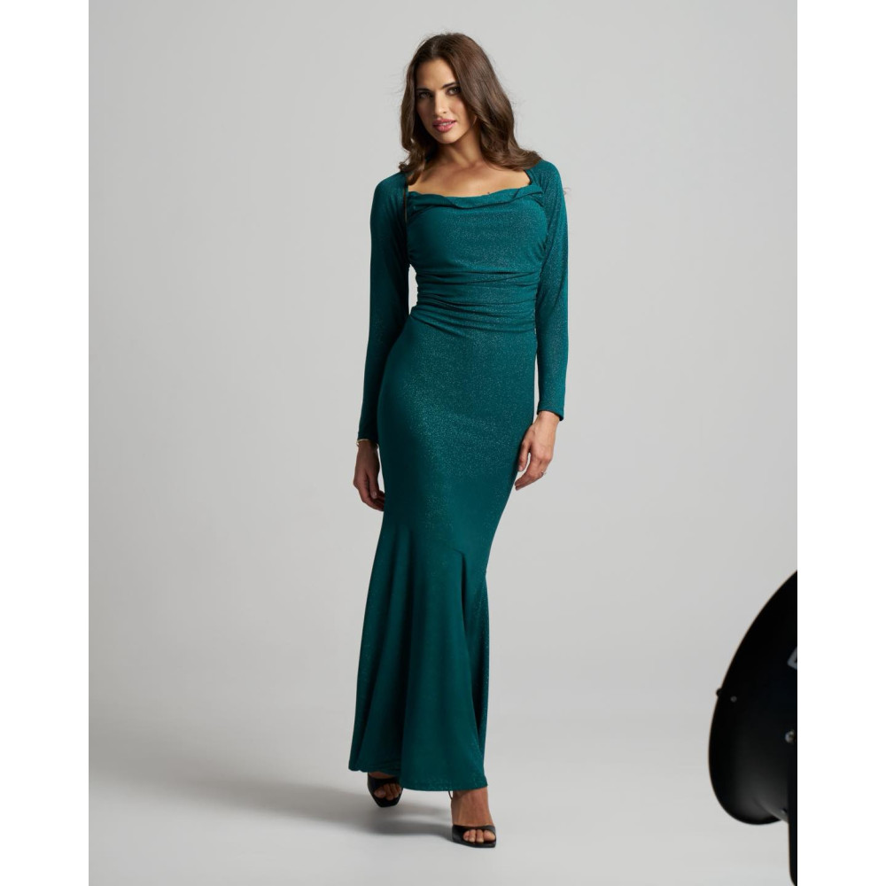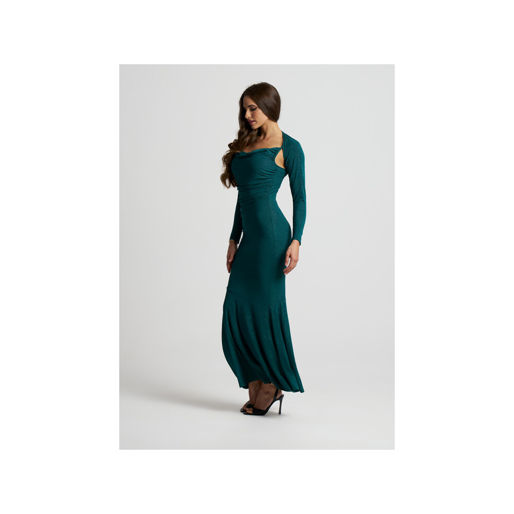 Envy sötétzöld, csillogó, oldalán húzott maxi ruha boleróval. Rugalmas.
