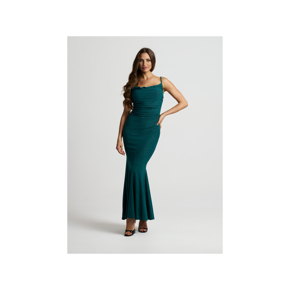 Envy zöld színű, oldalán és vállán húzott szatén maxi ruha. Rugalmas....