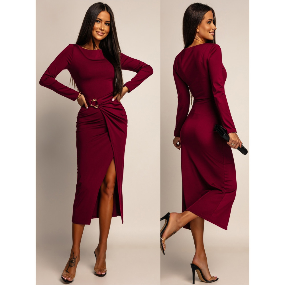 Bordó színű, mindkét oldalán húzott, elején felvágott, arany csatos ruha. Rugalmas.