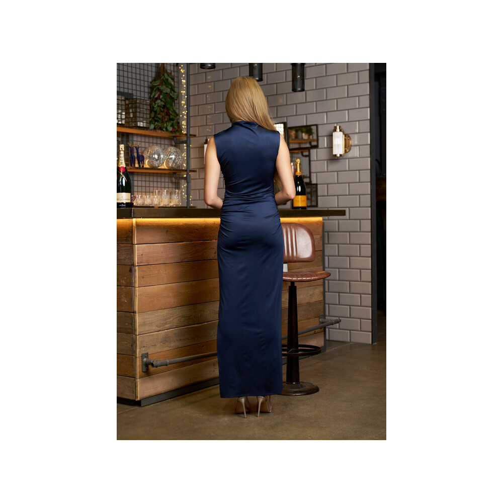 Envy sötétkék színű, oldalán és vállán húzott szatén maxi ruha. Rugalmas.