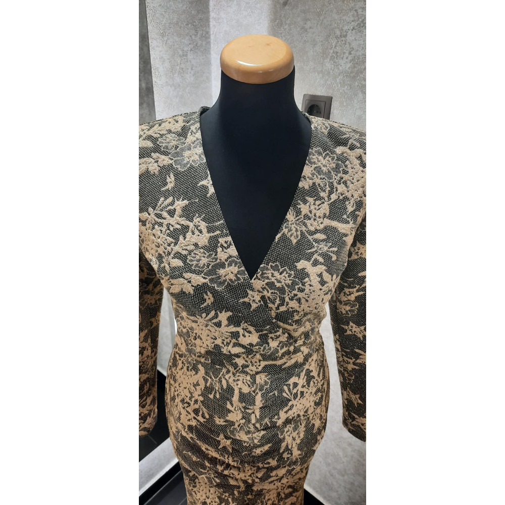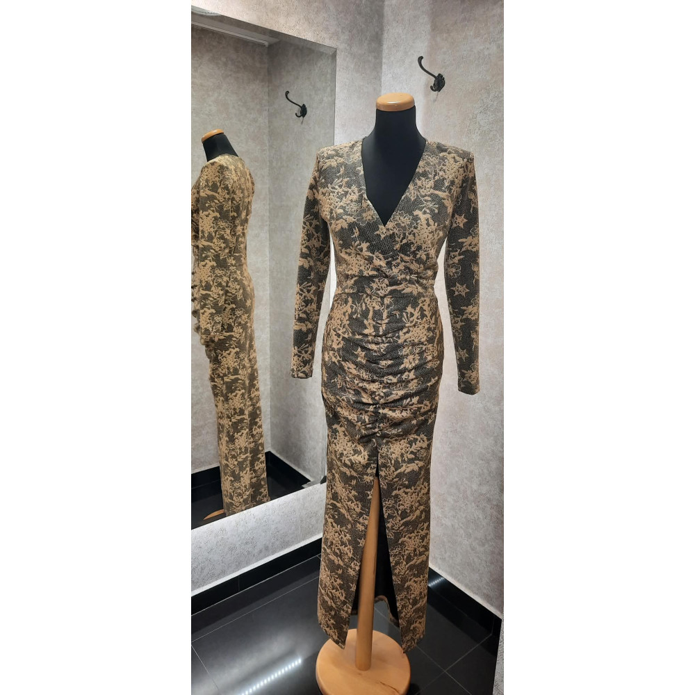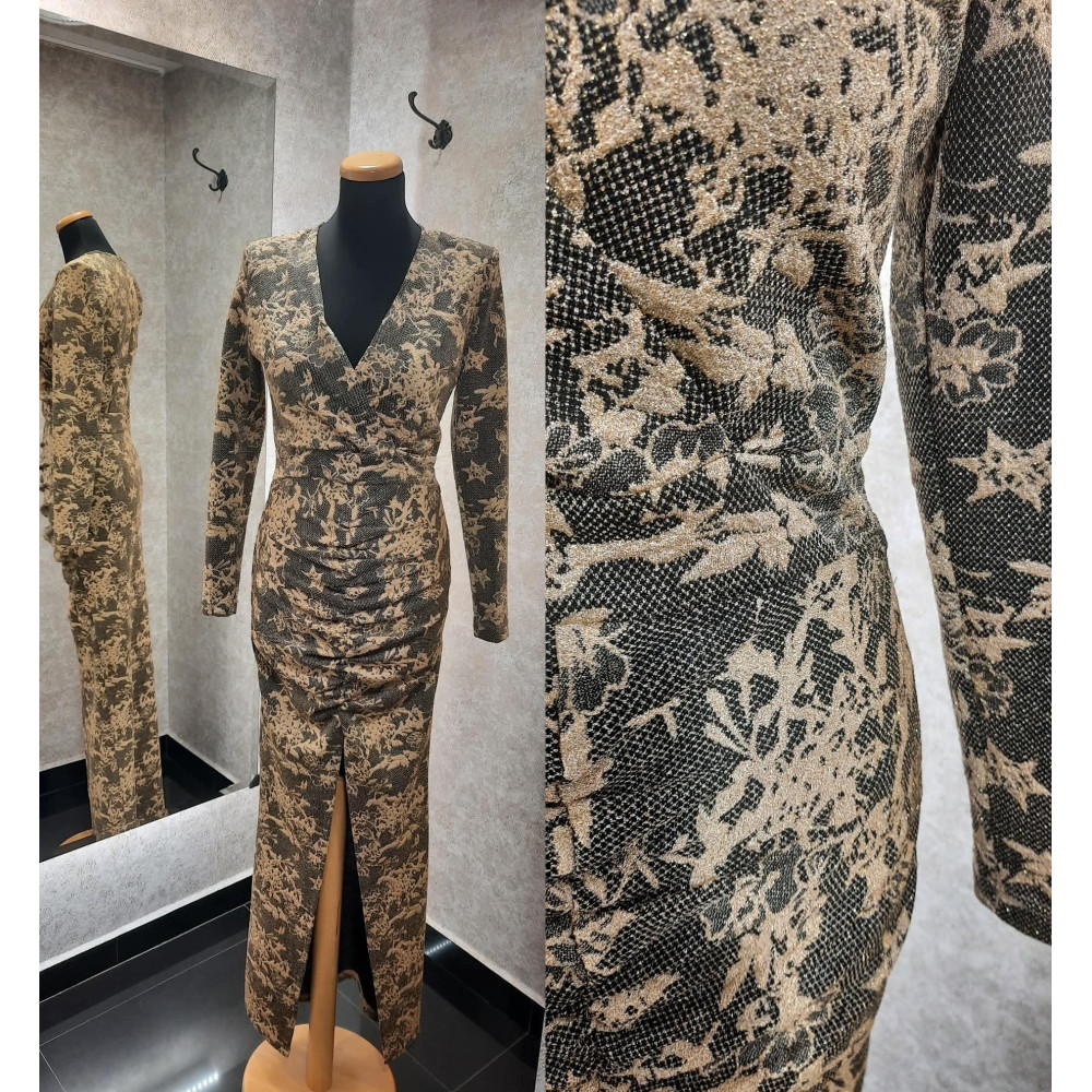 Envy fekete-arany csipke mintás, elején húzott és sliccelt, enyhén csillogó maxi ruha. Rugalmas.
