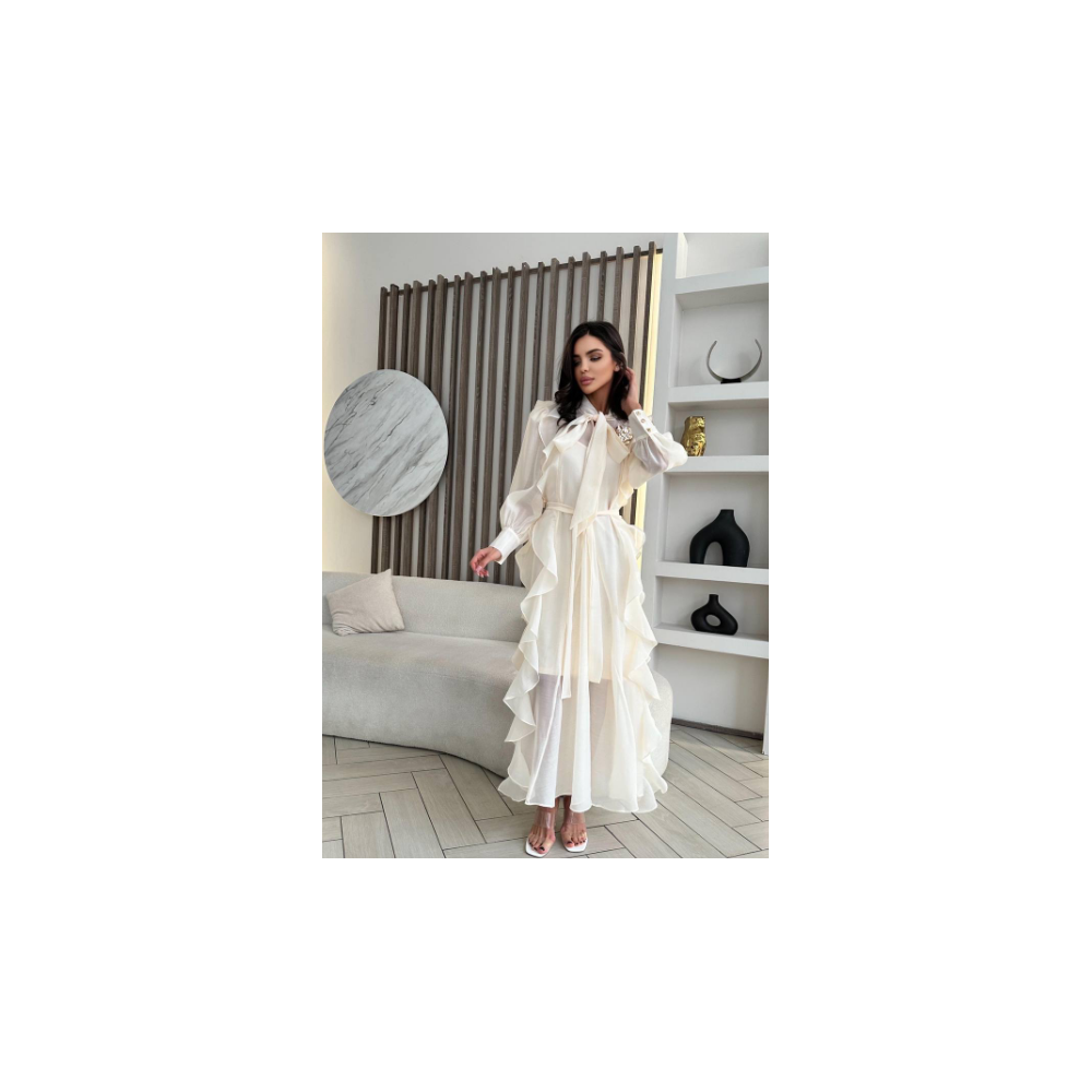 Vajszínű nyakán kötős maxi ruha, derekán kötővel. Hátrésze zárt, a ruha teljesen bélelt.