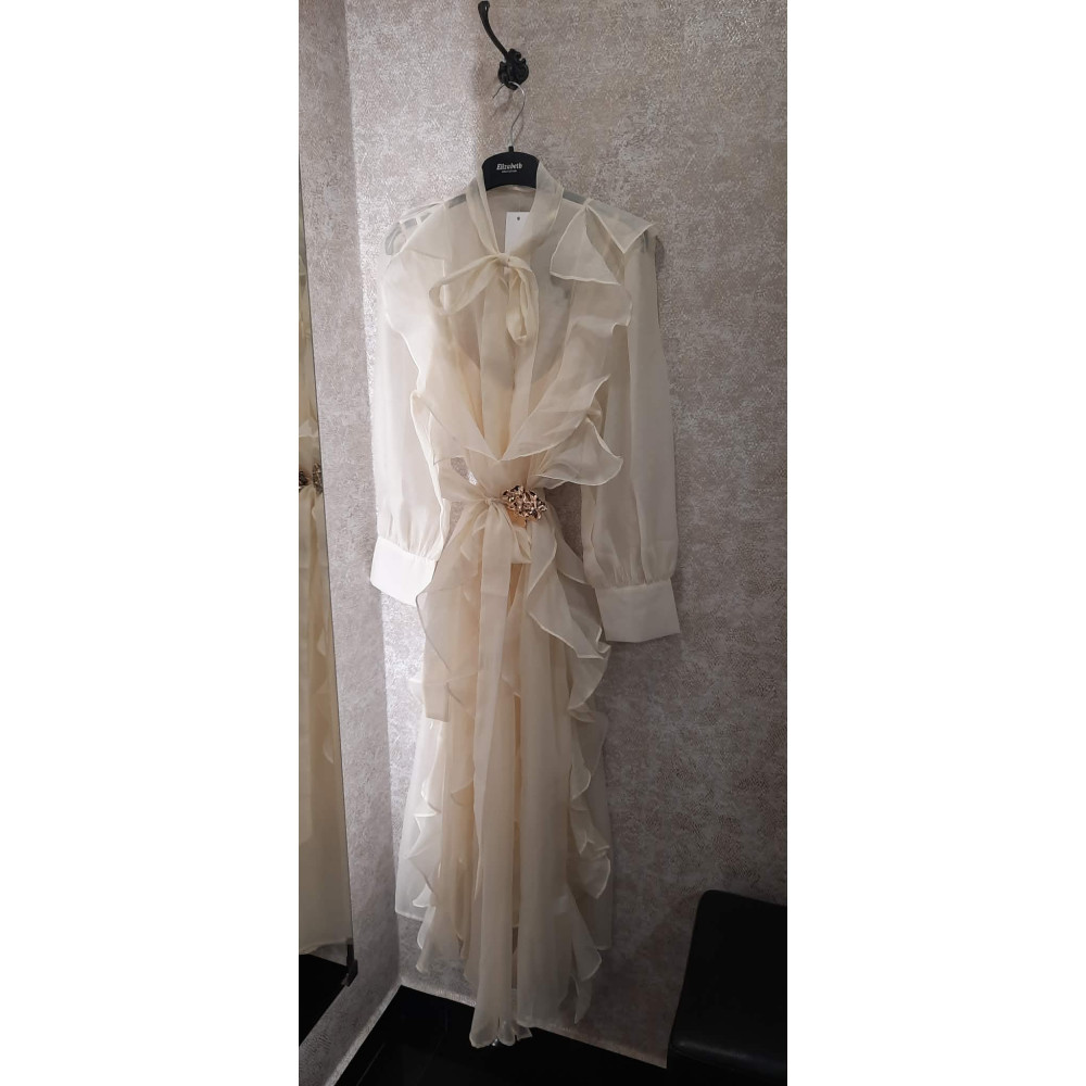 Vajszínű nyakán kötős selyem ruha, derekán kötővel. Hátrésze zárt, a...