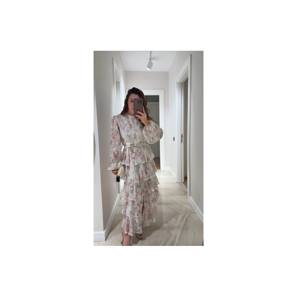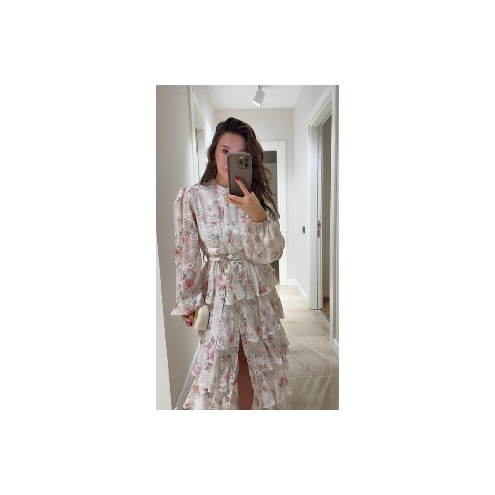 Bézs színű rózsákkal díszített fodros ruha, derekán és csuklóban...