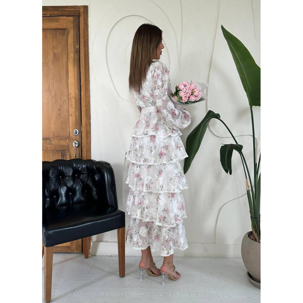 Fehér alapon virág mintás, hímzett fodros maxi ruha, derekán kötővel. Hátrésze zárt, a ruha teljesen bélelt.