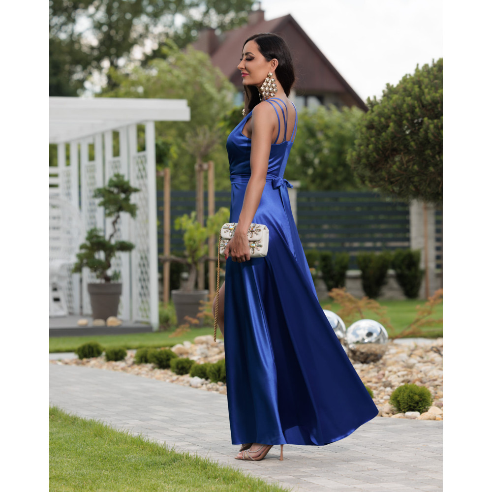 Királykék színű elöl felvágott, elején húzott szatén maxiruha. Oldalán rejtett cipzáras. Enyhén rugalmas.