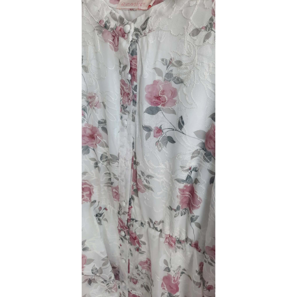 Fehér alapon virág mintás, hímzett fodros maxi ruha, derekán kötővel. Hátrésze zárt, a ruha teljesen bélelt.