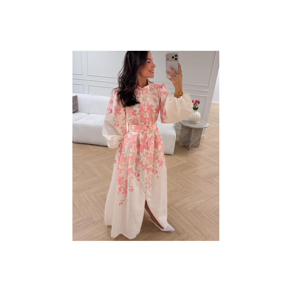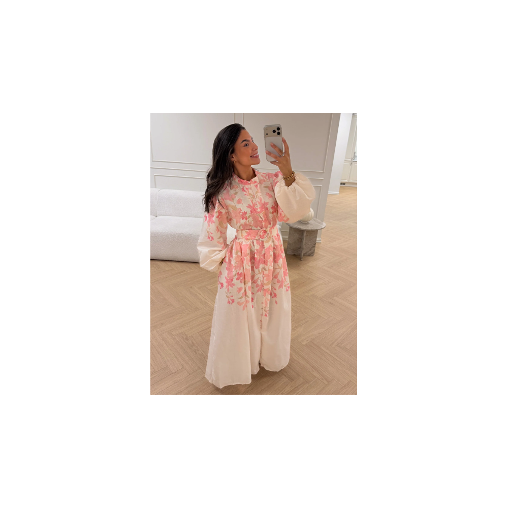 Törtfehér alapon rózsaszín virág mintás, buggyos ujjú maxiruha, övvel.