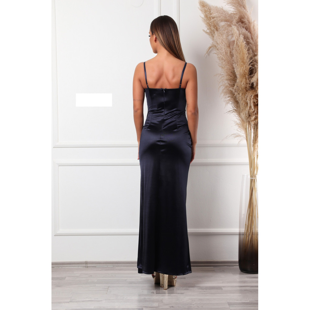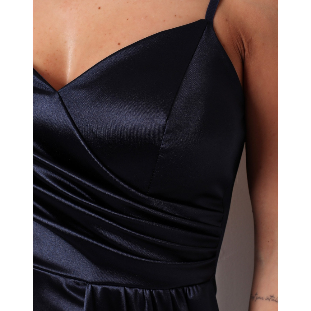 Sötétkék színű oldalt húzott, átlapolt, állítható pántos szatén maxiruha. Hátul rejtett cipzáras, mellrésze szivacs bélelt. Rugalmas.