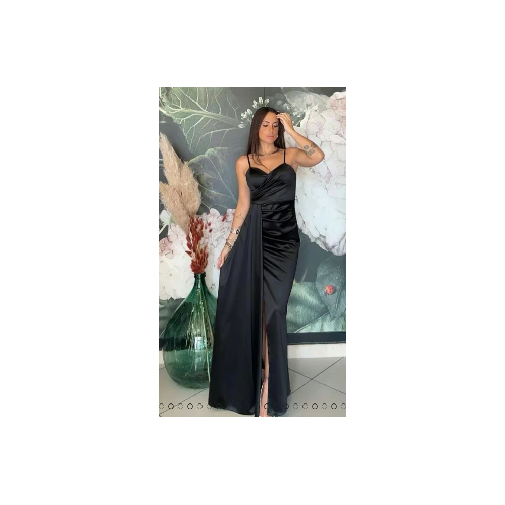 Fekete színű oldalt húzott, átlapolt, állítható pántos szatén maxiruha. Hátul rejtett cipzáras, mellrésze szivacs bélelt. Rugalmas.