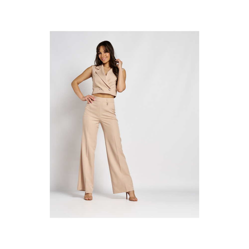 Bézs színű, extra magasderekú, arany kellékes bő szárú nadrág. Enyhén...