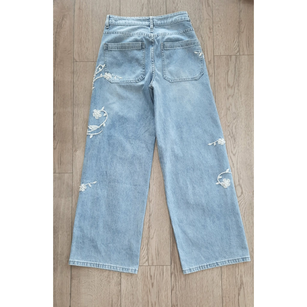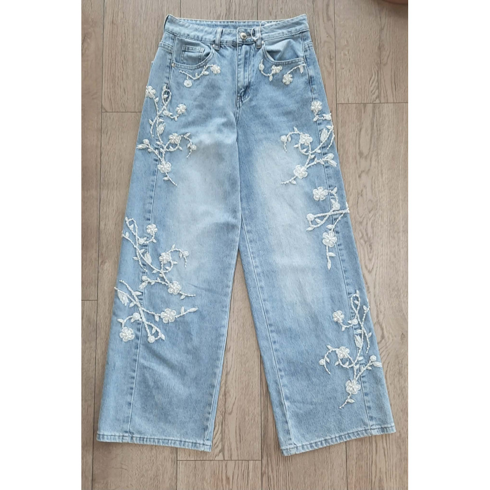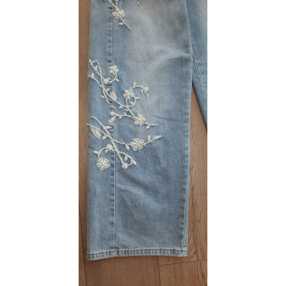 Világoskék színű, gyöngyös-hímzett, magas derekú bőszárú farmer....