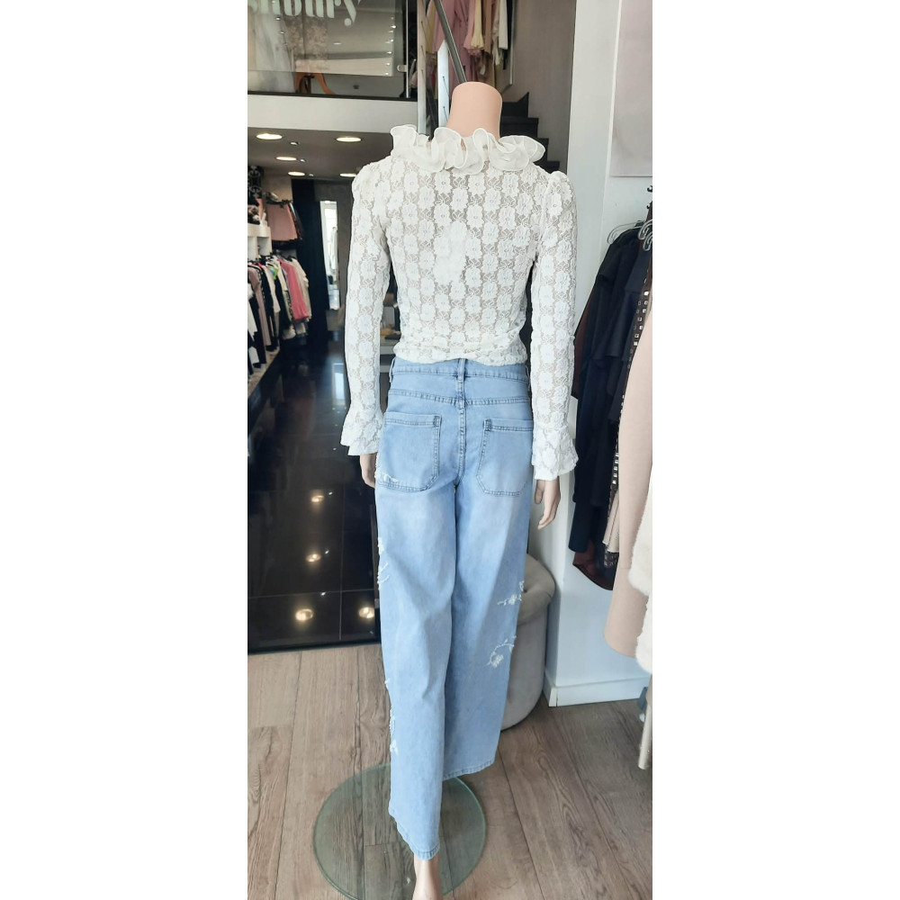 Világoskék színű, gyöngyös-hímzett, magas derekú bőszárú farmer. Rugalmas.