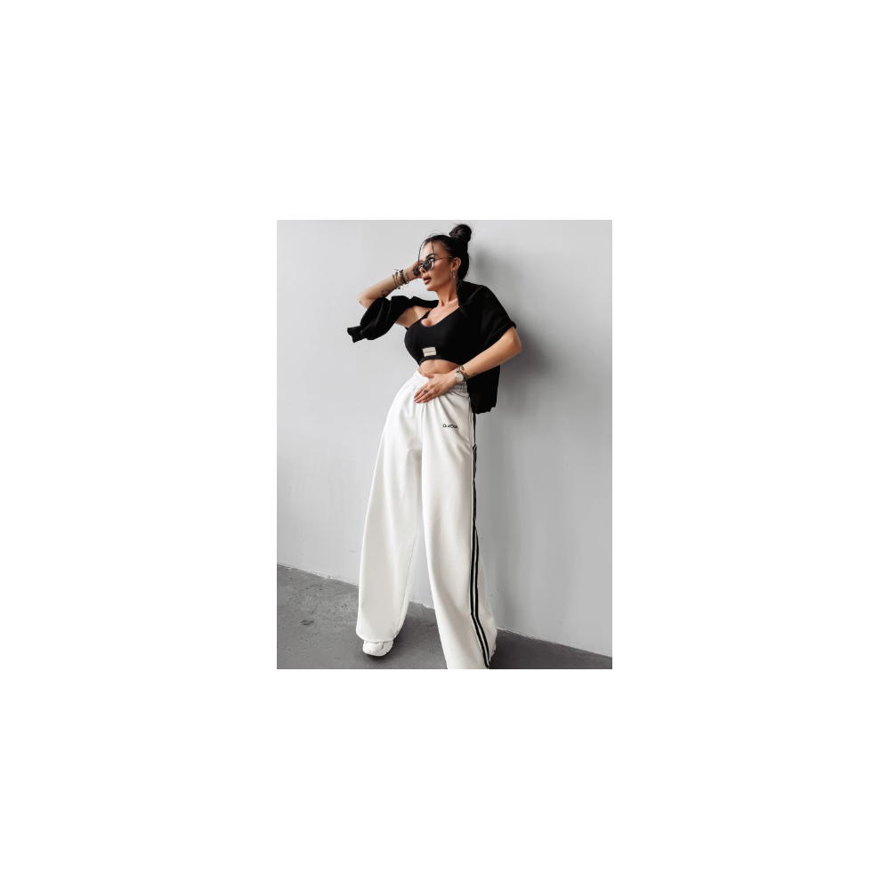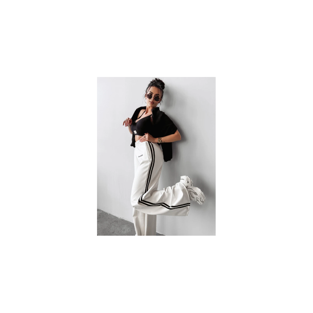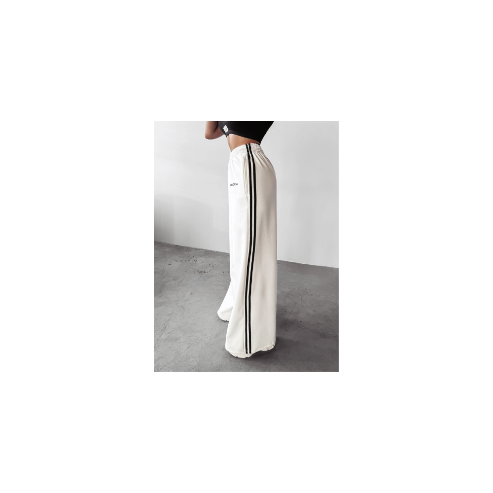 OLAVOGA törtfehér színű magas, gumis derekú nadrág, rejtett cipzáras zsebekkel, elején hímzett logóval, oldalán fekete csíkokkal. Rugalmas.