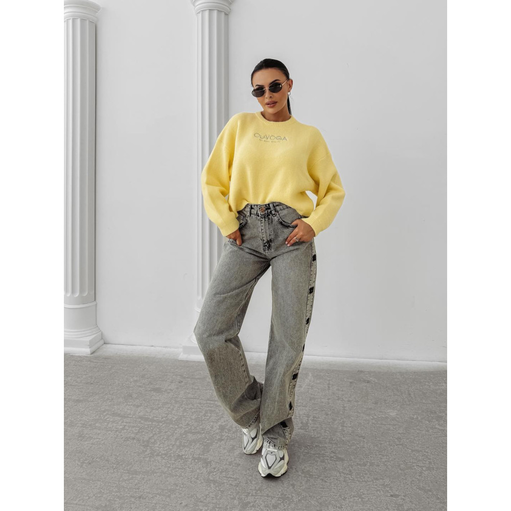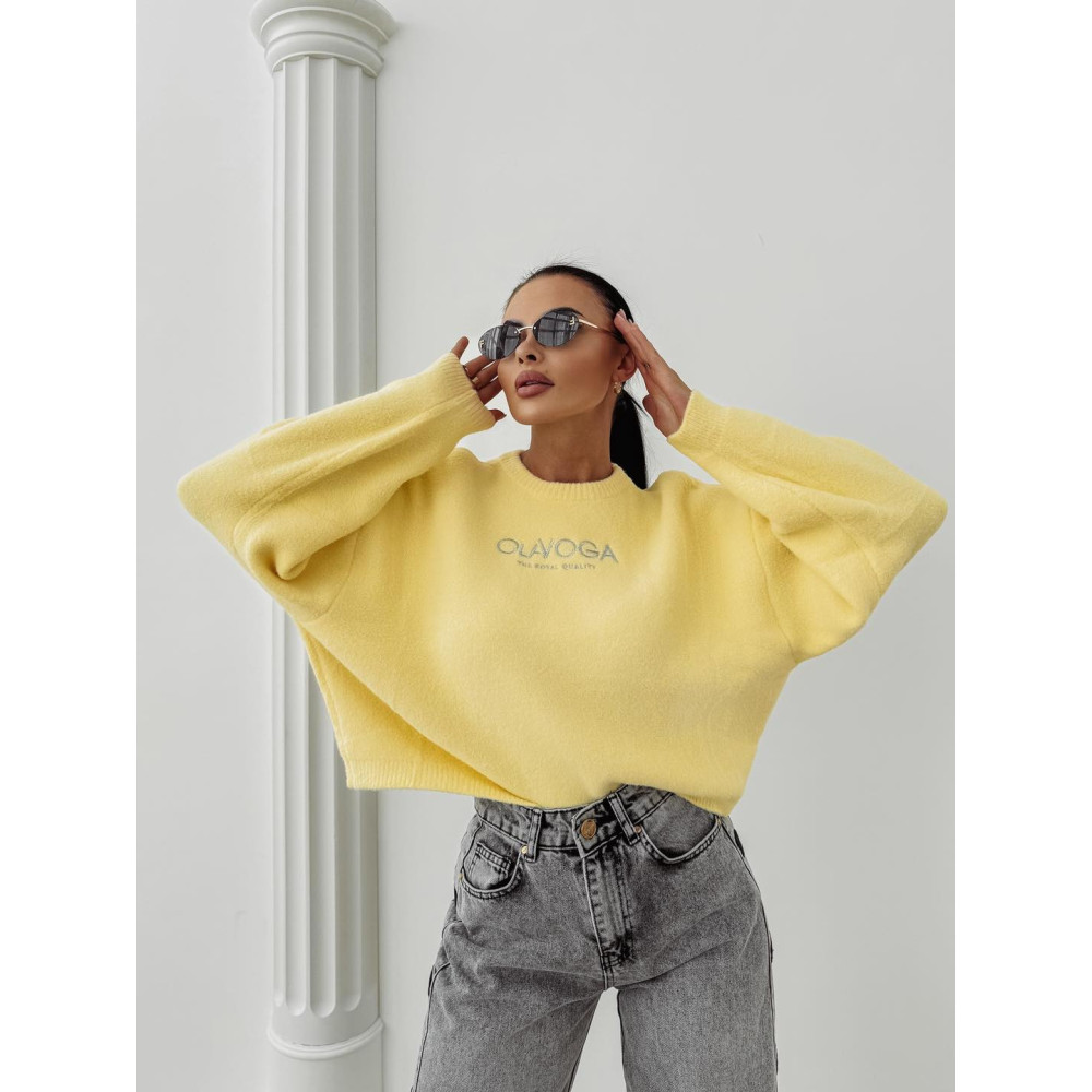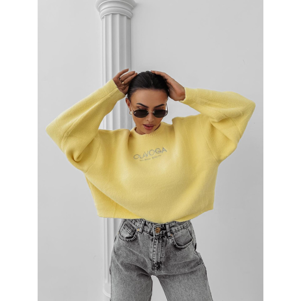 OLAVOGA sárga színű ejtett vállú kötött pulóver, elején márka logós hímzéssel. Rugalmas.