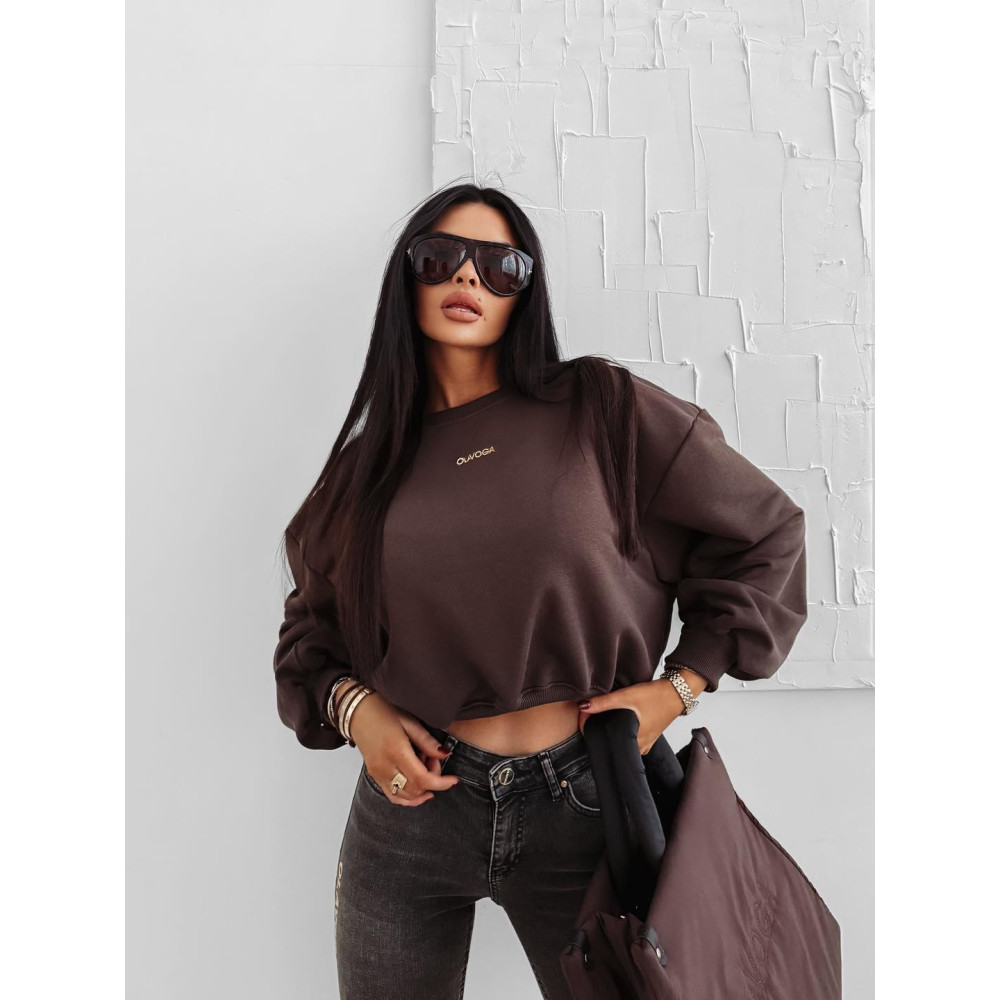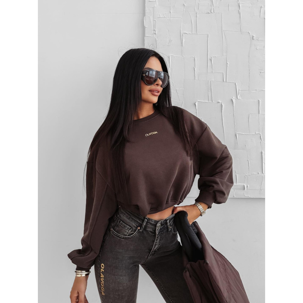 OLAVOGA csokibarna színű pamut pulóver, elején nyomtatott arany logóval, alján és ujján passzéval.