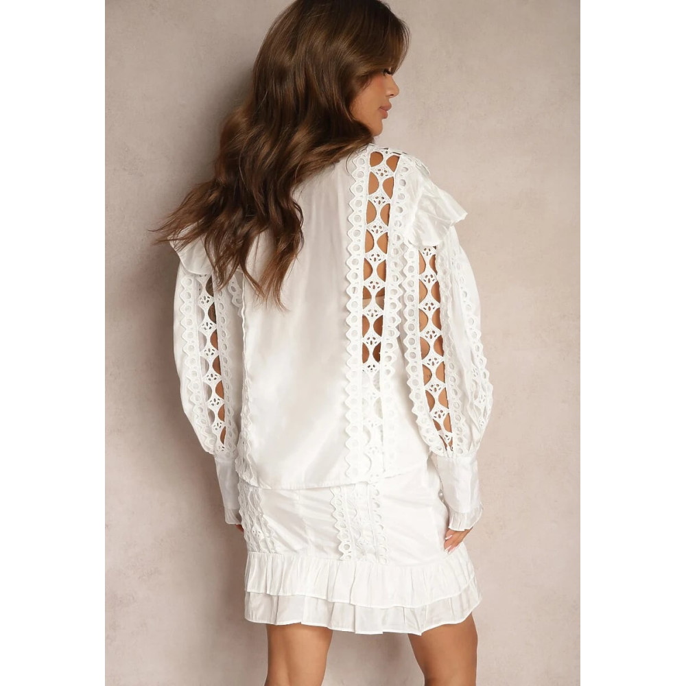 Törtfehér színű fodros kétrészes madeirás ruha (felső+szoknya).