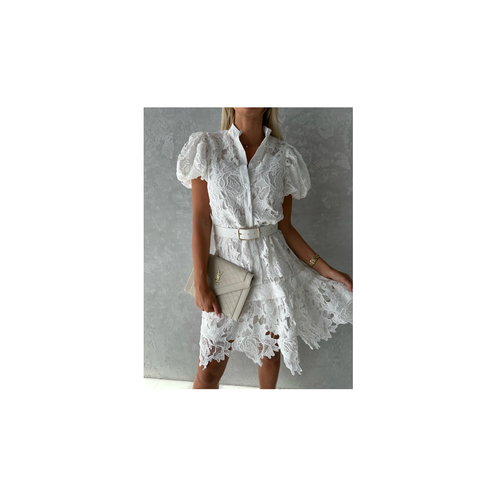 Fehér színű virágokkal díszített fodros csipke ruha, derekán és...