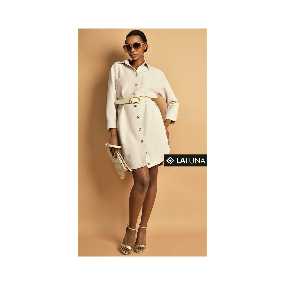 LaLuna bézs színű, arany gombos, zsebes ingruha kötővel. Enyhén rugalmas.