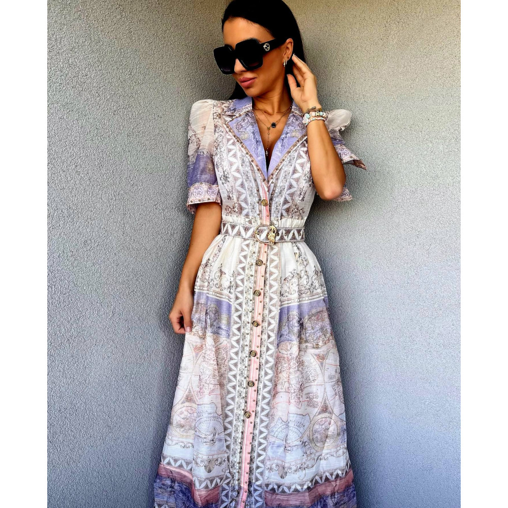 Bézs barna-lila mintás, rövid ujjú ruha övvel. Teljesen bélelt.