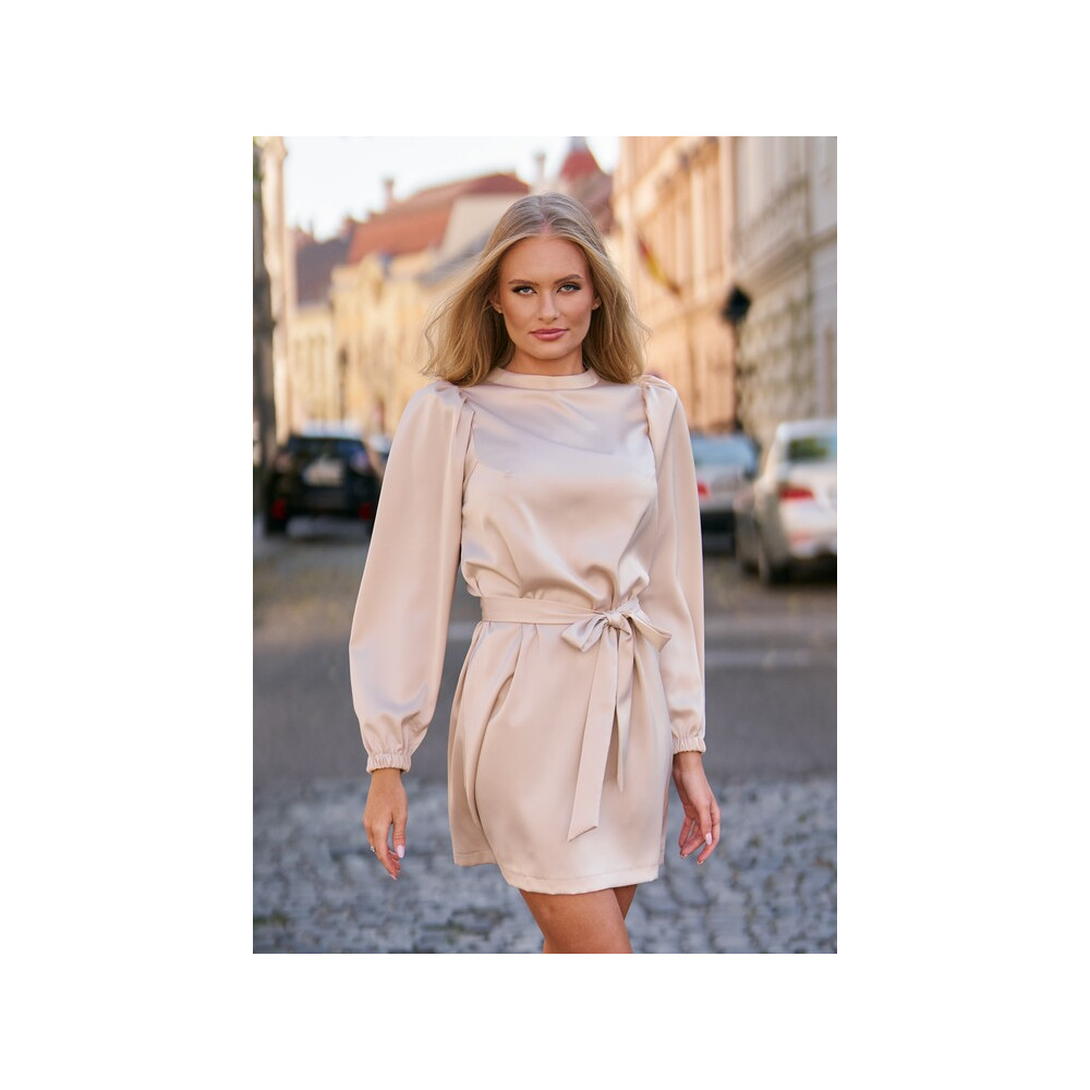Envy puffos ujjú beige színű, A-vonalú szatén ruha, derekán kötővel.