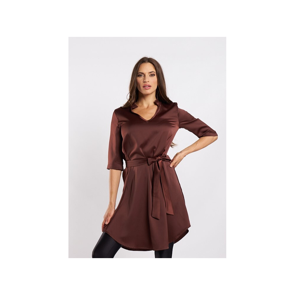 Envy 3/4-es ujjú barna színű, A-vonalú szatén ruha, derekán kötővel.