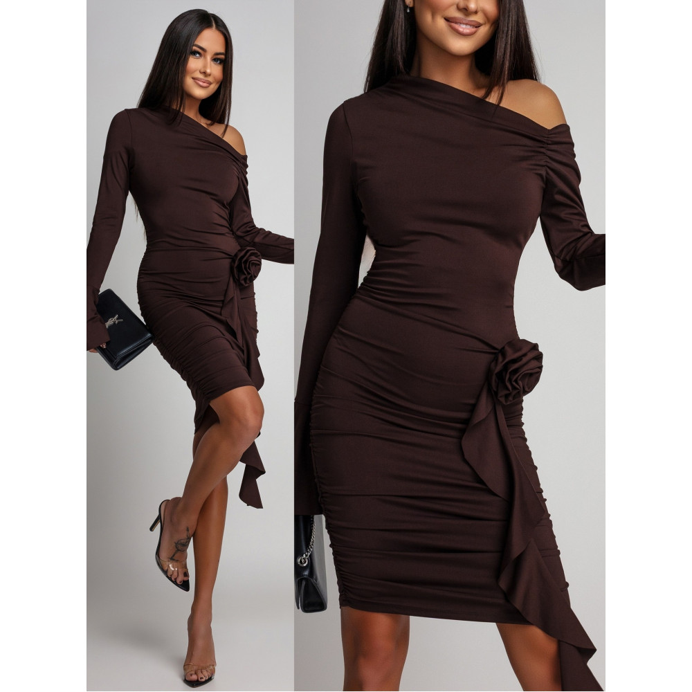 Barna színű, mindkét oldalt húzott poly ruha, levehető rózsa díszítéssel. Hátrésze zárt. Rugalmas.