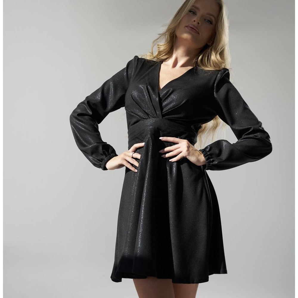 Envy fekete színű, fényes anyagú, puffos vállú mini ruha. Hátrésze zárt, cipzáras, ujja gumírozott. Rugalmas.